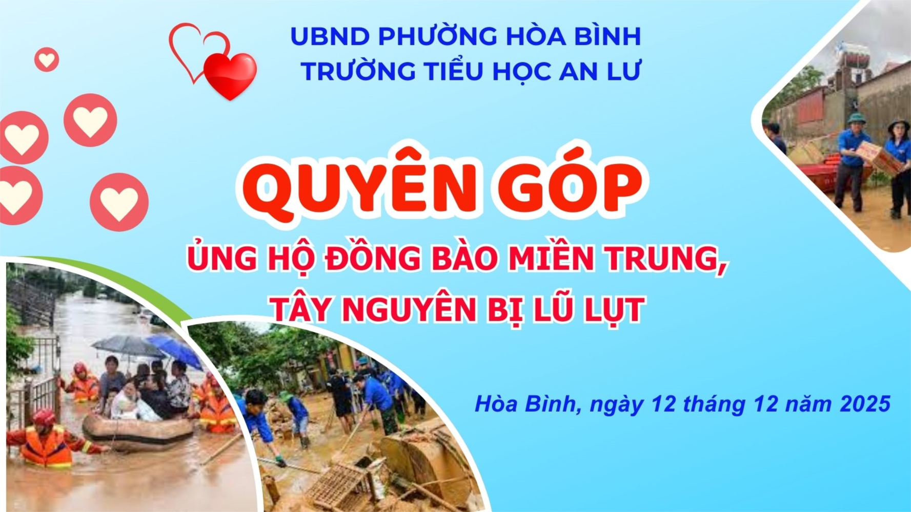 Miền Trung - Tây Nguyên đang trải qua những ngày vô cùng khó khăn khi những trận mưa lớn, lũ quét, sạt lở đã gây ra nhiều thiệt hại nặng nề về người và tài sản. Trong lúc hoạn nạn, tinh thần “lá lành đùm lá rách” càng trở nên quý giá hơn bao giờ hết. Hôm nay ngày 12/12/2025. Trường Tiểu học An Lư tổ chức "Quyên góp ủng hộ đồng bào Miền Trung - Tây Nguyên bị ảnh hưởng do lũ lụt", để cùng sẻ chia, lan tỏa yêu thương, hướng về đồng bào đang oằn mình trước thiên tai. Trong lúc khó khăn nhất, mỗi sự sẻ chia dù là nhỏ nhất cũng là một nguồn động lực lớn lao giúp bà con vượt qua hoạn nạn.
